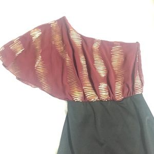 Maroon and black one shoulder dress with gold line accents on top , fitted bottom💫