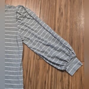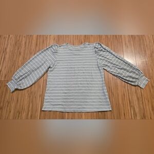 Stylish long sleeve top with puff sleeves. Features a classic striped pattern in light blue and white. Has a small amount of padding in the shoulders.