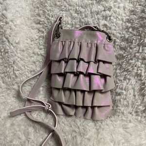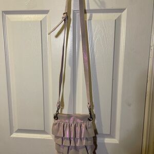 NWOT Maurizio Taiuti leather soft iridescent pink ruffle small crossbody bag snap top closure the inside lining has a side zipper and a side pocket .