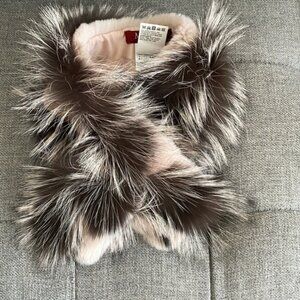 Unwanted gift. Like Brand new without the tag. Worn for few hours. Multi-tone pull-through scarf made with fox and rabbit fur (middle part is pink rabbit fur and the rest is grey fox fur). Add a layer of warmth to any look.