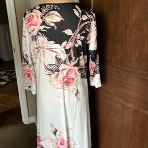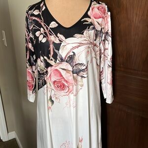 Brand new and is a very stretchy casual dress for an event or a beach day. White with rose and black and small amount of olive green and gray floral fabric. I bought and was too big for me but I missed the return date from a company based in China. 3/4 sleeves and v neck. See measurements in pics. Size XL 100% polyester and hand wash cold /line dry tag instructions.
