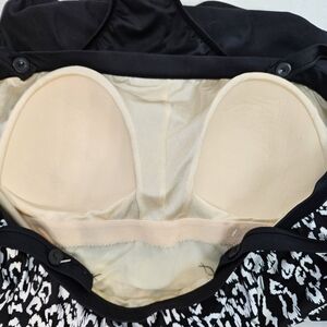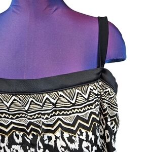 Make some waves while catching some rays in this one-piece swimsuit adorned gold Aztec print mixed with black and white Leopard print. Faux tuck one-piece design creates the look of a tankini. Built-in cups, adjustable and removeable straps, and a tummy toner work together to lift, support, and smooth your silhouette.