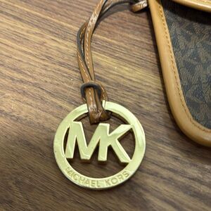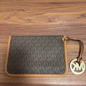 NWOT Michael Kors coated canvas with leather trim clutch /wristlet with snap closure. Comes with attached large Goldtone MK charm. Inside lined in beige logo fabric.