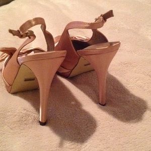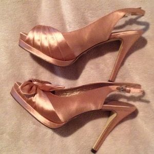 Nice looking menbur evening platform evening pumps satin upper pink round peep toe 4 inch high heels. Leather man-made sole. Topped with a satin bow. never used new, without tag or box