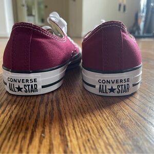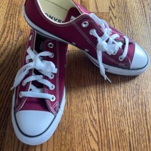 Step out in style with these Brand New Converse sneakers in an eye catching wine red and white color scheme. The classic design is completed with white laces and stitching, making them a fun addition to your wardrobe.