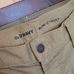 Khaki slim fit jeans by OLD NAVY. NWOT. Excellent condition. Button front, zip fly, 5 pocket, soft feel. Dark khaki in color.