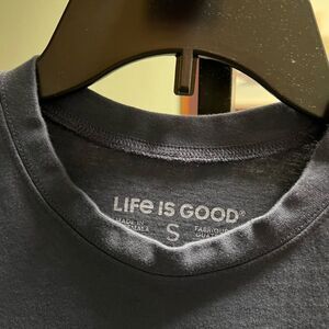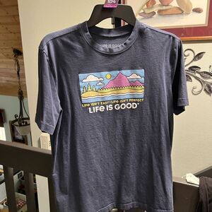 Blue graphic t-shirt with a colorful mountain design and 'Life is Good' text. brand new without tags from a smoke free home. Length 25”, pit to pit 20.6”.