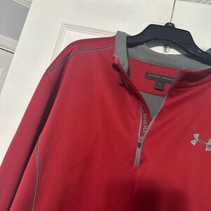 NWOT men’s Under Armour pullover jacket with a sleek quarter-zip with fold down collar. Vibrant red with subtle gray logo/brand details. Side zipper pockets and long sleeves. 100% Polyester material. Size XX large. Ideal for sports or casual outings.