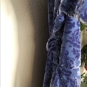 A gorgeous 2 layer dress wrap dress. Inside layer is a light weight semi sheer mesh-y material and the outside layer is another semi sheer material with velvet floral pattern. One side has the rope attached to it and the other has a hole to put the sting through to tie the wrap dress. Low v cut.
