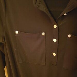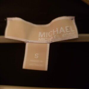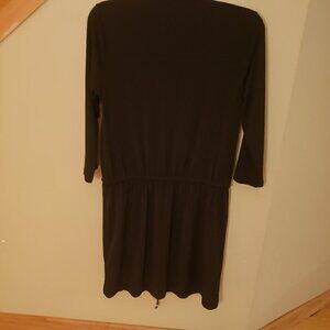 This gorgeous dress has many special features that make it the best little black dress that can go anywhere. The buttons are silver, designed to look like a screw head and branded with Michael Kors. The ends of the drawstrings are equally embellished. with the MK stamp. 3/4 sleeves