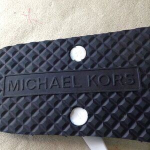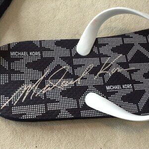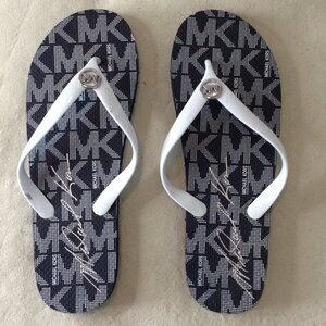 NWOT Michael Kors Black/White Flip Flops; 11, Logo with Silver accents; Beach