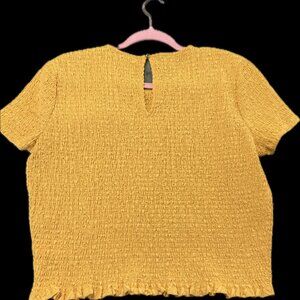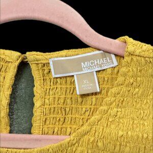 Yellow Michael Kors smocked short-sleeve crop top. The top is made of a textured, stretchy material and features a round neckline and a keyhole closure at the back. Smocking is a decorative technique that gathers fabric to create pleats, which allows for stretch and a form-fitting shape. This type of top is often worn in casual settings and can be paired with high-waisted jeans, skirts, or shorts.
