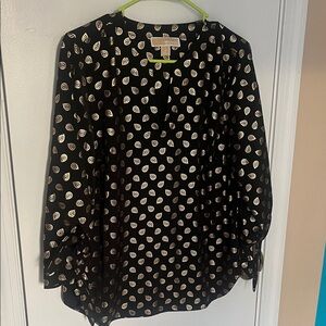 Elegant black top with gold patterns, perfect for any occasion. Stylish and comfortable for everyday wear.