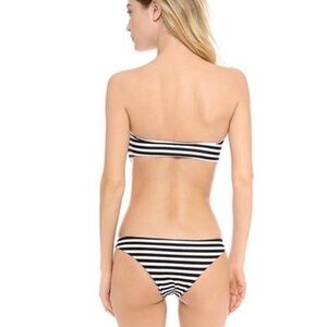 Strapless with molded cups, side and back cutout White and navy stripe, model shows fit in black and white stripe