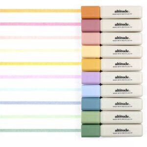 This set includes 10 mini highlighters made with recycled PP (polypropylene) plastic barrels. The chisel tip will help with precision when highlighting your notes. Your mind will be at ease knowing this product was made with sustainability at the top of mind.