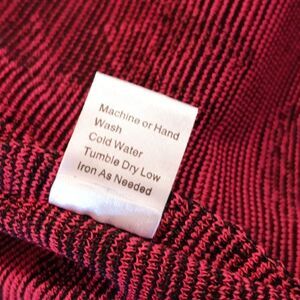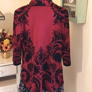 NEW. Bold red and black intarsia sweater jacket. Snap and button at neck. Overlapping collar. Slightly padded shoulders. 3/4 length, bell shape. 20 inch long sleeves. Open, A shape front with curves. Size XL measures 48 at chest, 54 at bottom hem. 29 long from shoulder to hem. 20 long to top of curve. Really stunning. Perfect over a black dress or pants.