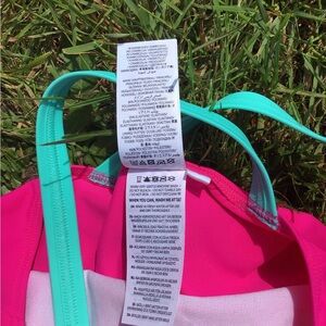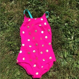 NWOT Mini Boden Cross-back One Piece Swimsuit Pink Gold Foil Spots 13-14 years