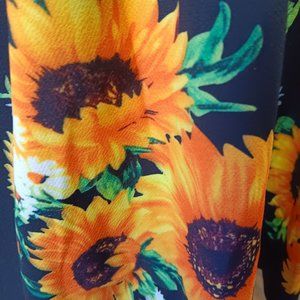 This fun summer dress highlights sunflowers on a black background. It can be worn with a modest shoulder or off-the-shoulder.