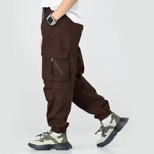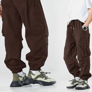 NWOT Mini Panda Kids Chocolate Brown Cotton Joggers with black drawstring, side cargo pockets with decorative zipper
