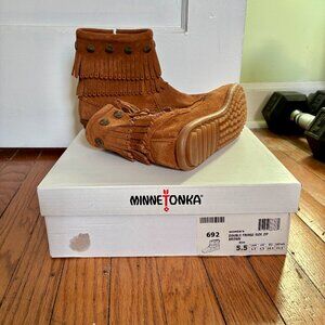 Brand new Minnetonka fringe moccasin boots in pristine, never-worn condition with the original box included. These women’s suede ankle moccasins feature Minnetonka’s signature two-layer fringe, detailed hand-stitched toe seams, and decorative metal concho accents. Made from soft genuine suede in a rich chestnut brown, these boho moccasin boots offer flexible comfort and a lightweight feel perfect for everyday wear.