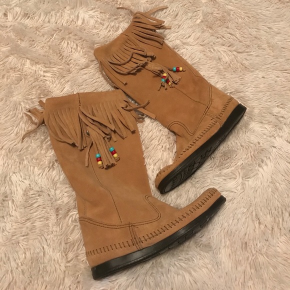 Absolutely gorgeous and perfect Minnetonka boots. They are BRAND NEW. I actually got them years ago but I never wore them and kept them in the box the entire time. Took photos of the soles for proof 😂. The thing that makes them so rad (other than just being the most perfect boot ever) is that they have a button where you can attach little extra beaded fringe accents if you choose to! Size 5. Perfect for festivals!