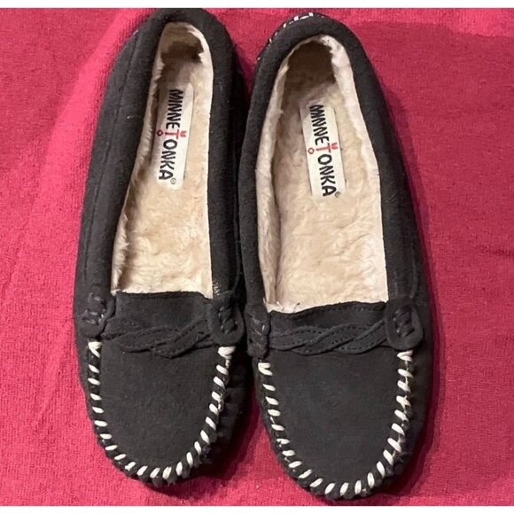 Classic moccasin-style slippers featuring a soft suede upper in a dark grayish-blue tone with cozy cream faux fur lining. Designed with a stylish suede braid detail across the vamp and a durable rubber sole, making them perfect for both indoor lounging and quick outdoor wear. Comfortable, warm, and effortlessly timeless. Never worn, Size 8