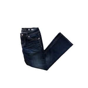 NWOT Miss Me Womens Denim Jeans Mid Rise Bootcut Dark Wash Rhinestone Size 28 Inseam 29”.