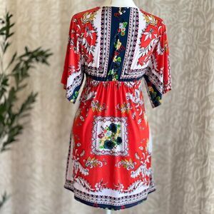 Description: stretchy red multicolor bandana, floral paisley print short sleeve empire waist baby doll top by Miss Mima in US women’s size S