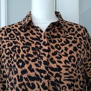 Short sleeve shirt style oversized smock dress in a leopard print with concealed button placket down front.