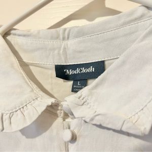 NWOT ModCloth white ruffle blouse ♡ Washed once but never worn with no tears, stains, piling, or signs of wear. Adorable to pair with many styles; can be layered under dresses or sweater!s! No longer sold on the ModCloth website. I also have the matching black shirt for sale!