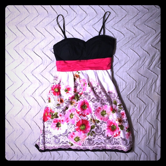 Adorable floral and lace print fit and flare mini dress from Modcloth (brand is City Triangles). Black, white, and pink with spaghetti straps, back zipper, and tie back.