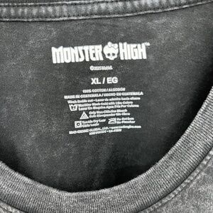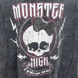 Monster High World Ghoul Tour 2010 Women’s Short Sleeve T-Shirt. This is NOT an oversized shirt. Screen-printed graphic on front. Color: Distressed bleached light black/dark gray. Lightweight 100% cotton. Machine wash cold inside out with like colors. I have more than one of this shirt. The look of the bleach distressing on the shirt you receive may be different from that shown here in the photos.