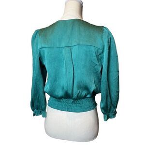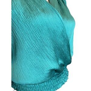 NWOT Monteau Green Top Cross front elastic waist, puff sleeve, wrap front. satiny, silky, classy. NEW never worn nor washed. See photos for details and measurements. professional, business, casual, office, party, st. patrick's, airy, flowy, breezy, vacation