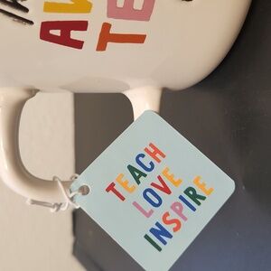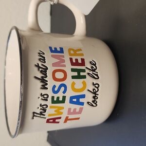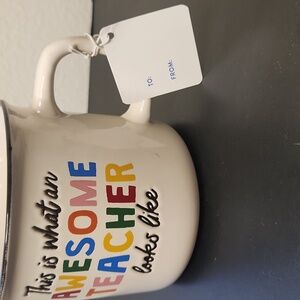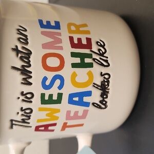 This mug features a vibrant design with the phrase 'This is what an awesome teacher looks like.' Perfect for educators. The word "looks" is a little blurred on one side of the mug.