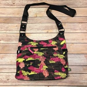 Multicolored crossbody bag with several outside pockets(largest one's interior shown in pic 6) and two small inside pockets. Approximately 14" across and 11" tall. At its longest strap is approximately 37" but can be adjusted shorter.