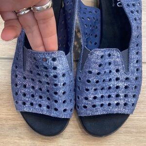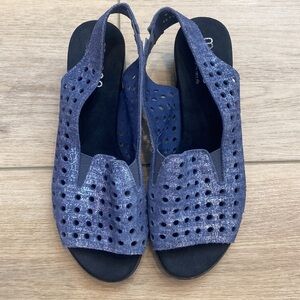 Comfortable and versatile Perforated dot cut out sling backs by Munro. The generously cushioned and molded microfiber-lined footbed with added arch support makes these short heel sandals great for all day wear. The metallic silver crosshatching overlay on the blue suede adds just a touch of shimmer that easily allows these casual shoes to dress up. In New without tags flawless condition, only ever tried on. size 6