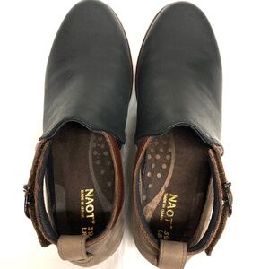 These are NWOT NAOT Leather Block Heel Velcro Boots. A nice black, brown and tan color combination with a faux buckle and Velcro closure. The block heel is a dark brown 1” with a black rubber sole surrounding it. The front is a black leather and the tan heel area is a soft suede. The top black has a few slight creases most likely from trying on but they are NWOT. Size: 39 L8. Stylish, casual, comfortable.