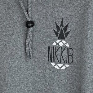NWOT NIKKI B (NIKKI BLACKLETTER) is a Youtube and Instagram fitness model, fitness guru, and all around social media ROCK STAR. She is the ambassador for the fitness clothing brand, GYMSHARK, and she has her own line of clothing at nikkibsportswear.com and an online official merch store at shopnikkib.com. This is such a high quality hoodie by Gildan (Heavy Blend;) it's pretty thick and VERY well made, it's got a very unique grainy grey color that just elevates the entire piece, and it has such a cute graphic logo with her name NIKKIB within a geometric pineapple design. Moreover, the black drawstring fastener just matches the vibe of the pineapple; it almost looks like it's made out of wood because of the pineapple, but it's actually just a black plastic sphere, very cute little detail that also just elevates the hoodie. It's cute, it's casual, and it just gives me Hawaiian or surfer vibes, definitely beachy and preppy chic. NWOT BRAND NEW AND FLAWLESS; NEVER WORN SIZE: Women's L %50 Cotton %50 Polyester