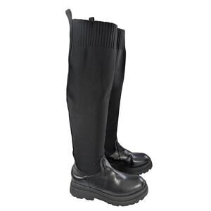 From No Doubt come these awesome fabulous military inspired skintight boots! In luxe black faux leather and heavy elastic, with a big chunky heel and tread! So cool! Slip-on, over the knee! 2" heel, 20.5" shaft height, 15" (adjustable- all elastic)- shaft width at calf! Size 10M, used in one show, otherwise: ***NEW Without Tags, and Guaranteed Superb by Lily @HauteClub!* *Measurements always available on request!*
