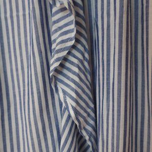 Beautiful lightweight summer midi dress from Naif in Size S. Small French blue and white stripe pattern. Faux wrap front with ruffles. Faux tie waist with thin elastic waist to created a fitted look.