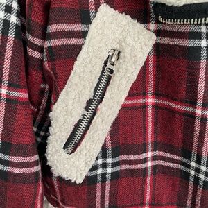 Adorable plaid jacket with teddy sherpa-like trim and zip pockets in the front. Perfect for any cooler day.