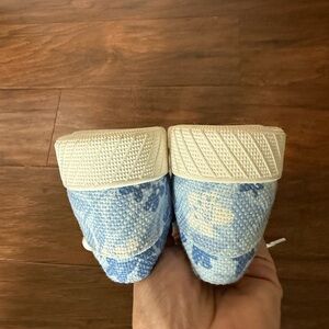 Step out in style with these chic white and blue sneakers. Perfect for casual outings, these shoes offer both comfort and elegance. These shoes are brand new, without original box or tags. It is a sporty white shoe with a blue floral Crosstitch fabric. These shoes are a man-made leather with a gum/rubber sole. This is a women’s size 6. All of my items are well cared for and come from a smoke free home.