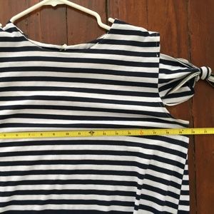 Soft tee with navy and white nautical stripe and tie detail at shoulder. Material is comfy, and sleeves can be re-tied to loosen to tighten arm holes. I fell in love with this top online but never wore it out of the house; however, there is a small mark by the button closure at the back. Not really noticeable and might remove easily, but I wanted to call it out.