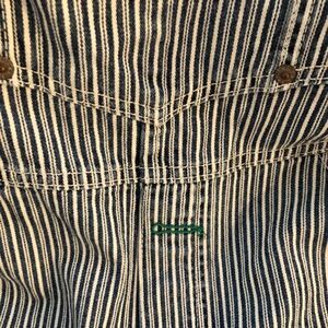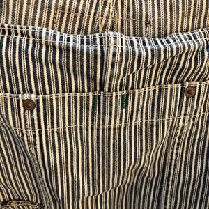 The short-alls feature navy and white vertical stripes, a faux front fly, copper and white ‘lei’ brand front side buttons (two on each side), and a 10.25 x 7-inch front pocket that has compartments for different sized items (such as a pen or comb). The short-alls’ inseam measures 5 inches.
