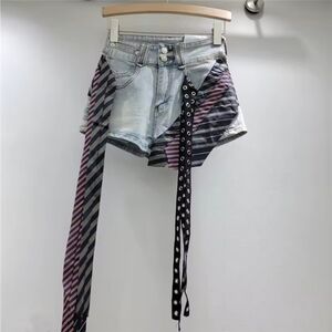NWOT Neck Tie Patchwork Grommet Ribbon Edgy Punk Denim Jean Shorts