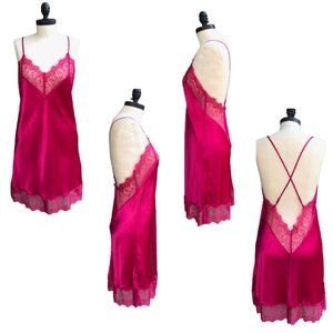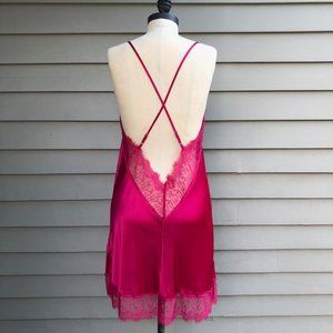New 100% Silk Charmeuse Criss-Cross Low Back Deep Berry Pink Lace-Trimmed Nightie Chemise Négligée Full Slip Mini Dress by Nordstrom Lingerie