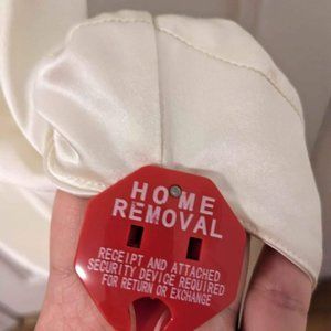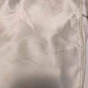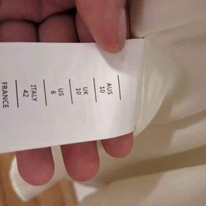 White satin twist front cut-out long-sleeve gown. Brand is Nicholas, original price is $595. Brand new, never worn. Tag fell off, but still has red home removal tag attached as shown. Perfect for bridal or other events. Some marks at bottom as shown in last picture, only visible up close, have not tried removing.