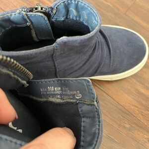 These kids shoes by Nina are a classic navy blue micro suede scrunch boot/shoe. Stylish and comfortable and Perfect for everyday wear. These are brand new, without tags or original shoebox. There are no flaws or defects to this well-made shoe. The shoe has a cushioned memory foam insole and flexible nonslip outsole. All of my items are well cared for and come from a smoke free home. Considered offers are welcomed. These are priced below retail store pricing.