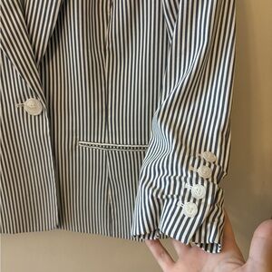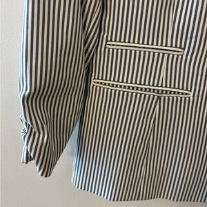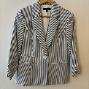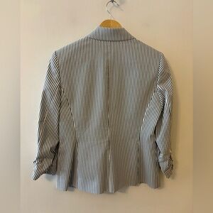New without tags blue and white striped cotton blend seersucker striped blazer with ruched sleeve cuffs. Size 6. Coastal, preppy, nautical, office, career, work.