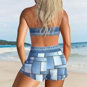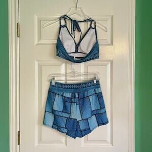 No Brand, bought off Amazon - Blue denim patch print, high waisted bikini shorts that are lined inside, halter bikini top with removable pads. Both are Women's Size Small.